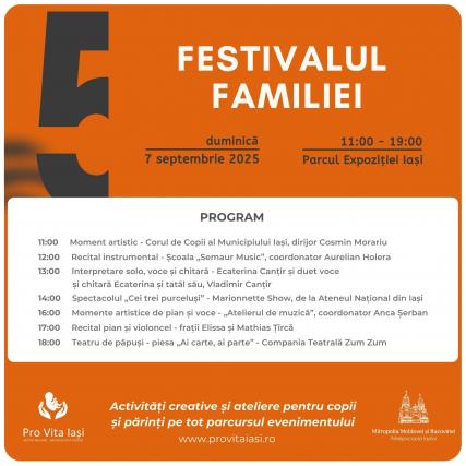 Pentru al cincilea an consecutiv, Arhiepiscopia Iașilor, prin Departamentul Pro Vita din cadrul Sectorului de Misiune, organizează Festivalul Familiei. Evenimentul va avea loc duminică, 7 septembrie, între orele 11:00 - 19:00, în Parcul Expoziției din Iași.