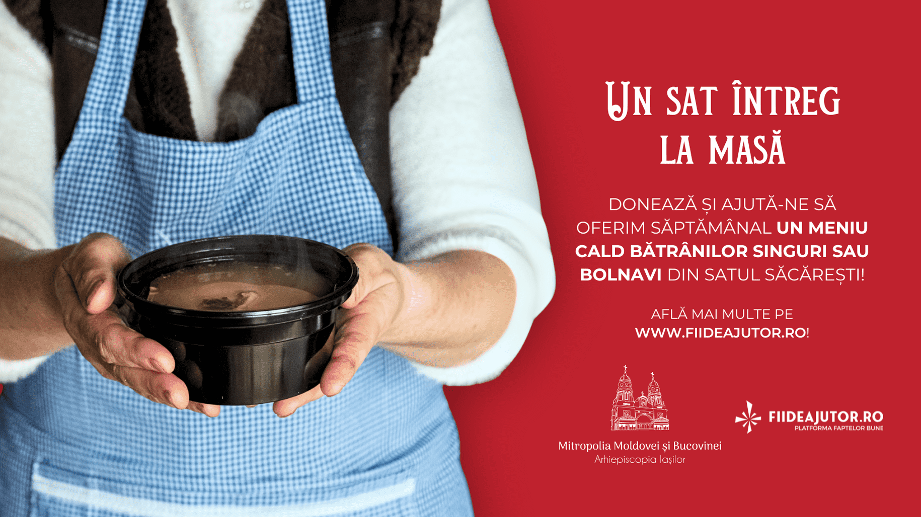 fiideajutor.ro lansează o inițiativă de strângere de fonduri pentru vârstnicii din satul ieșean Săcărești. Campania „Un sat întreg la masă” își propune să ofere câte un meniu cald săptămânal unui număr de 50 de bătrâni, bolnavi sau singuri, pentru a le alina din greutățile zilnice și a le arăta că nu sunt singuri. Valoarea unui pachet este de 20 RON, iar credincioșii sau companiile care vor să se implice prin donații sau produse pot face acest lucru accesând www.fiideajutor.ro, Platforma Faptelor Bune a Mitropoliei Moldovei și Bucovinei.