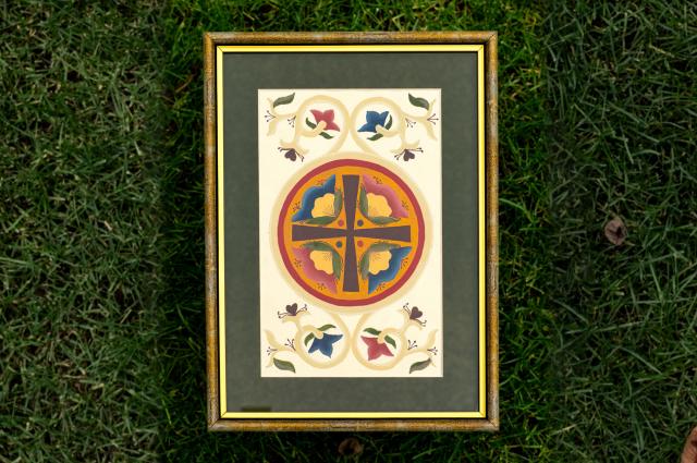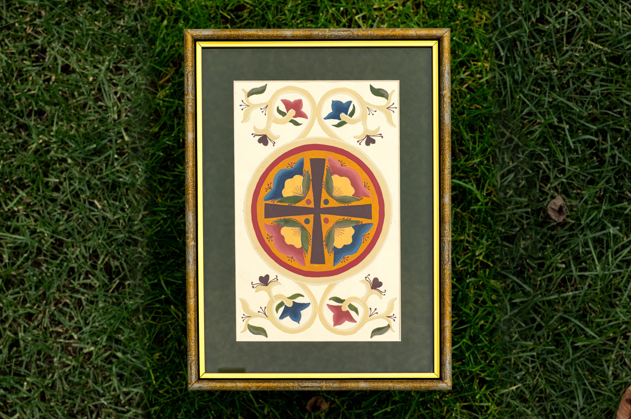 Prima lucrare prezintă în centrul compoziției o cruce circulară încadrată de motive florale stilizate. Formele sunt curate, simetrice, iar paleta cromatică este caldă și echilibrată. Centrul picturii este construit ca un medalion bizantin, unde crucea este însoțită de patru flori, simbol al celor patru puncte cardinale și al răspândirii luminii lui Hristos în lume. Fondul deschis, în contrast cu rama aurie și verde închis, pune în valoare delicatețea picturii, făcând din această piesă un obiect decorativ elegant.
