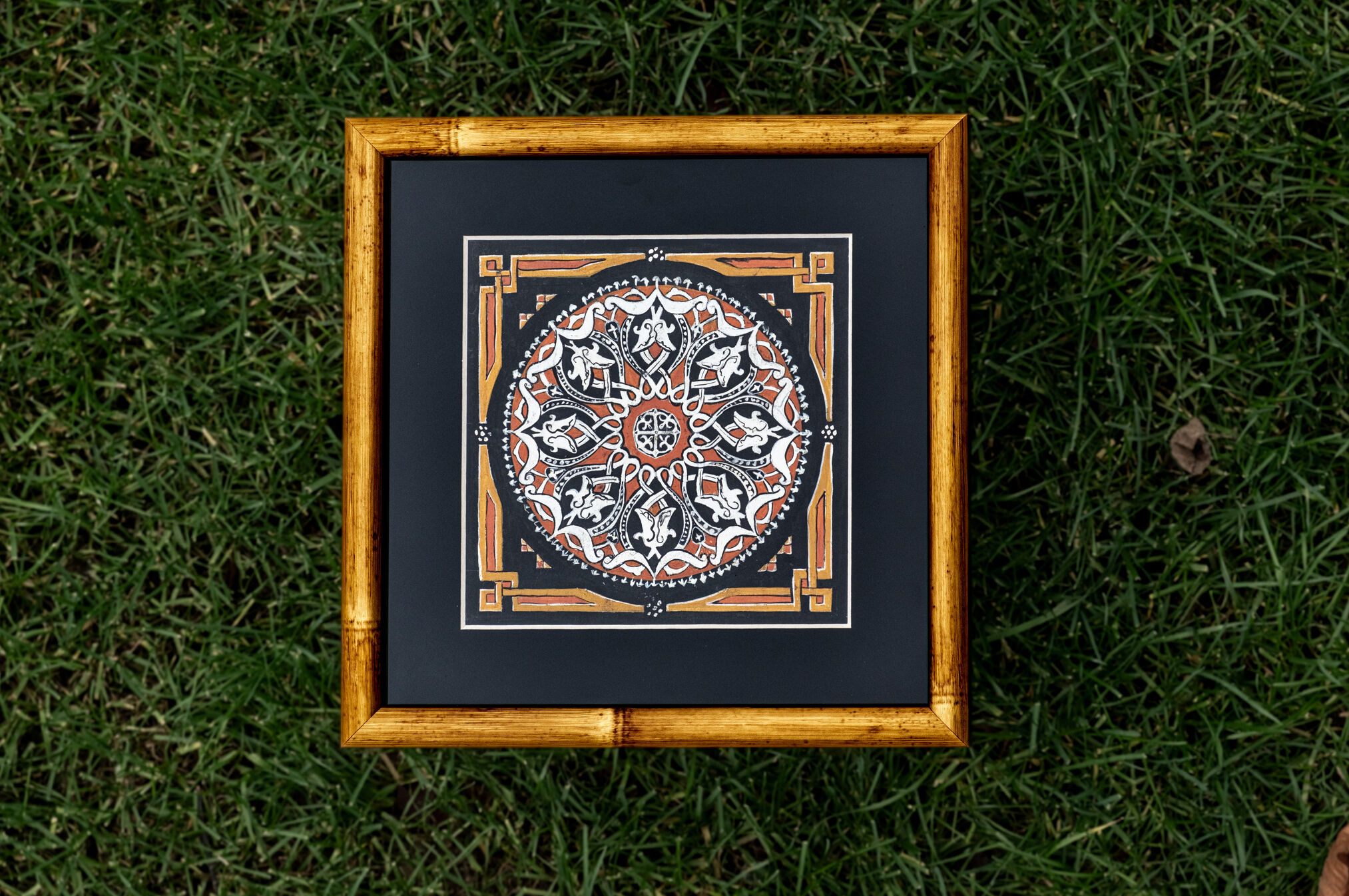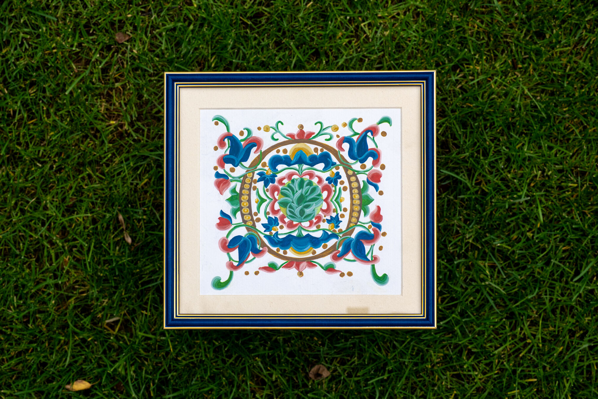 Acest ornament de inspirație bizantină reconstituie rafinamentul decorativ al vechilor manuscrise sacre. Compoziția, construită într-o simetrie perfectă, este alcătuită din volute florale, frunze stilizate și accente aurii, toate dispuse în jurul unui nucleu vegetal central. Culorile vibrante sunt aplicate în tempera cu ou, tehnică tradițională care oferă luciu, profunzime și delicatețe fiecărei forme. Rezultatul este o lucrare armonioasă, luminoasă și plină de eleganță.