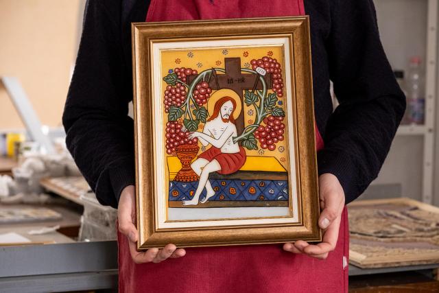 Această icoană pictată în stil naiv reprezintă o expresie artistică profundă a cuvintelor Mântuitorului: „Eu sunt vița, voi sunteți mlădițele” (Ioan 15, 5). Hristos Domnul este înfățișat într-o postură meditativă, înconjurat de ciorchini de struguri, simbol al jertfei Sale și al Euharistiei. Crucea din spatele Său poartă inscripția „IIS - HR”, iar în mâinile Sale strânge rodul viței, care se varsă în potirul vieții — imagine puternică a sângelui vărsat pentru mântuirea lumii. Stilul naiv al icoanei aduce o candoare aparte, accentuând profunzimea mesajului prin simplitate și culoare vie. Această reprezentare ne cheamă la rămânerea în Hristos, singura Viță adevărată, prin credință, rugăciune și viață curată, pentru a aduce roade vrednice de Împărăția Cerurilor.