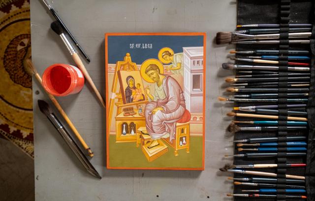 O icoană pe lemn în care vedem nu doar un artist, ci un sfânt care împlinește o lucrare tainică: prima icoană a Maicii Domnului cu Pruncul Iisus. Sfântul Luca, evanghelistul iubirii întrupate, devine aici ocrotitorul iconarilor, zugrav al chipului ceresc în culori pământești. În spatele lui, un înger veghează. Nu doar îl inspiră, ci binecuvântează gestul mâinii care se lasă purtată de har. Pictura devine rugăciune, iar icoana – fereastră spre Împărăție. Nu este vorba despre talent, ci despre ascultare și smerenie în fața chemării de a face vizibil nevăzutul. Această reprezentare ne aduce aminte că icoana nu se pictează cu pensula, ci cu inima luminată și că fiecare culoare, fiecare detaliu, este o mărturisire de credință. Privind această lucrare, suntem invitați să vedem arta ca slujire și frumusețea ca drum spre Dumnezeu.