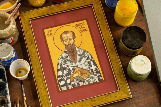 Această icoană este chipul înțelepciunii unite cu fapta, al ierarhului care a trăit Evanghelia printre cei mai lipsiți, ridicând așezăminte în care bolnavii erau îngrijiți, flămânzii hrăniți, orfanii ocrotiți — spital, cantină, școală, casă pentru cei fără adăpost, toate izvorâte dintr-o singură credință: că dragostea lui Hristos se vede în grijă concretă pentru aproapele. Privirea sa pătrunde dincolo de hârtie, chemând la milă și la lucrare. Îmbrăcat în veșmintele arhierești, ținând Evanghelia, Sfântul Vasile cel Mare este prezentat aici ca apostol al milostivirii, pildă de dăruire și rugăciune. Această icoană este un cuvânt fără glas care ne întreabă: ce zidim noi din dragostea pe care o primim?