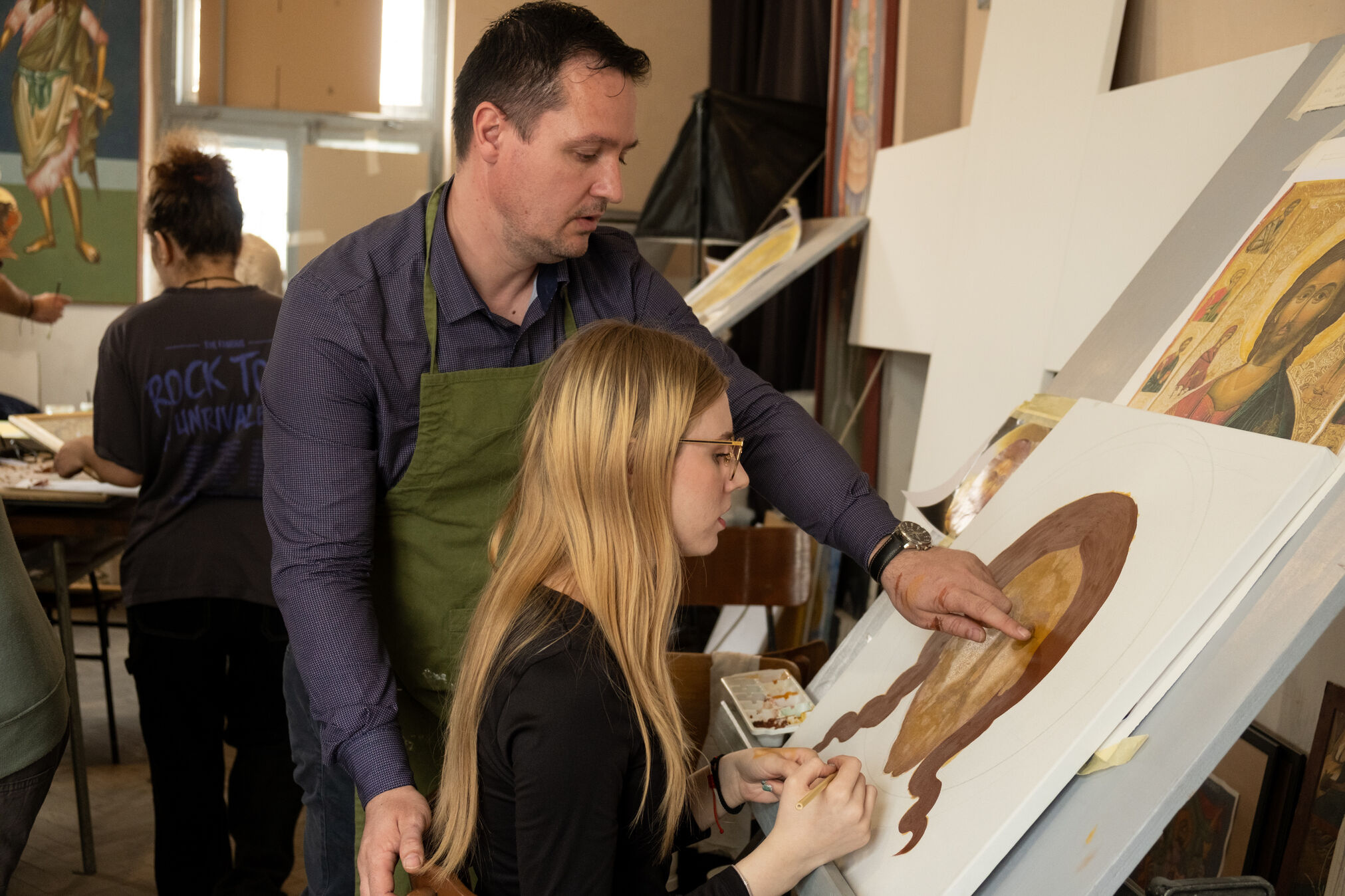 În atelierele de Artă Sacră, studenții învață desen, perspectivă, compoziție. Dar mai ales învață limbajul culorilor, căci acestea poartă în ele sens și teologie.