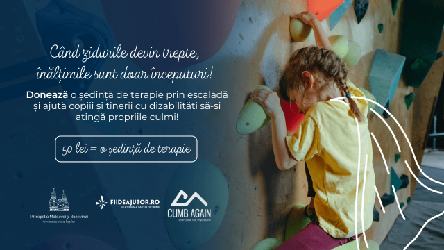 În luna iunie, fă cadou cadou o ședință de terapie prin escaladă și ajută copiii și tinerii cu dizabilități să atingă culmile propriului potențial! Poți face asta prin platforma donorbox sau direct pe fiideajutor.ro, prin PayPal sau prin transfer bancar.