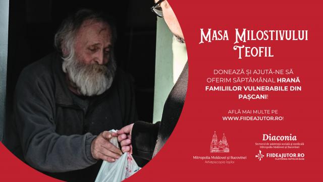 Platforma fiideajutor.ro lansează o inițiativă de strângere de fonduri pentru familiile vulnerabile din municipiul Pașcani. Campania „Masa Milostivului Teofil” își propune să asigure câte un pachet alimentar săptămânal unui număr de 97 de bătrâni, bolnavi sau persoane aflate în dificultate, pentru a le alina din greutățile zilnice și a le arăta că nu sunt singuri. Valoarea unui pachet este de aproximativ 35 RON, iar credincioșii sau companiile care vor să se implice prin donații sau produse pot face acest lucru accesând www.fiideajutor.ro, Platforma Faptelor Bune a Mitropoliei Moldovei și Bucovinei.