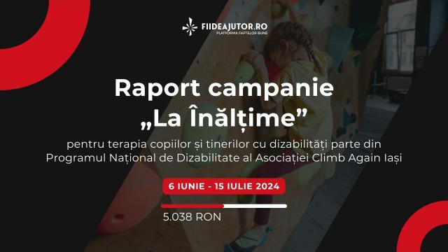 Proiectul „La Înălțime”, în parteneriat cu fiideajutor.ro și Climb Again Iași, și-a propus asigurarea ședințelor de terapie timp de o lună pentru cei 50 de beneficiari ai Programului Național de Dizabilitate din Iași, în semn de apreciere și încurajare în luna dedicată celor mici. Obiectivul financiar a fost 10.000 lei, sumă ce poate asigura câte patru ședințe de escaladă terapeutică pentru copiii și tinerii cu afecțiuni motorii, neuromotorii, deficiențe de vedere sau de auz.